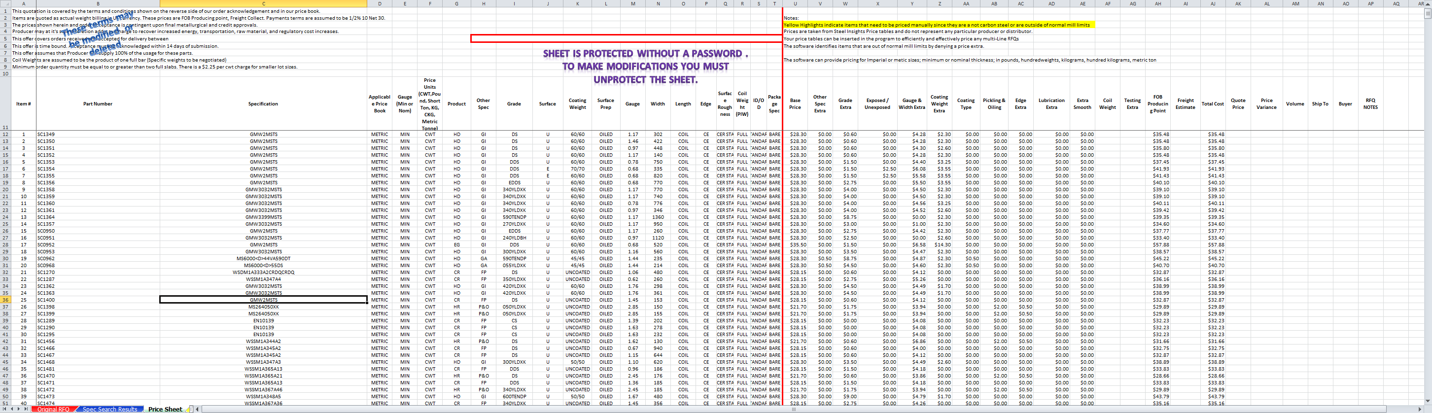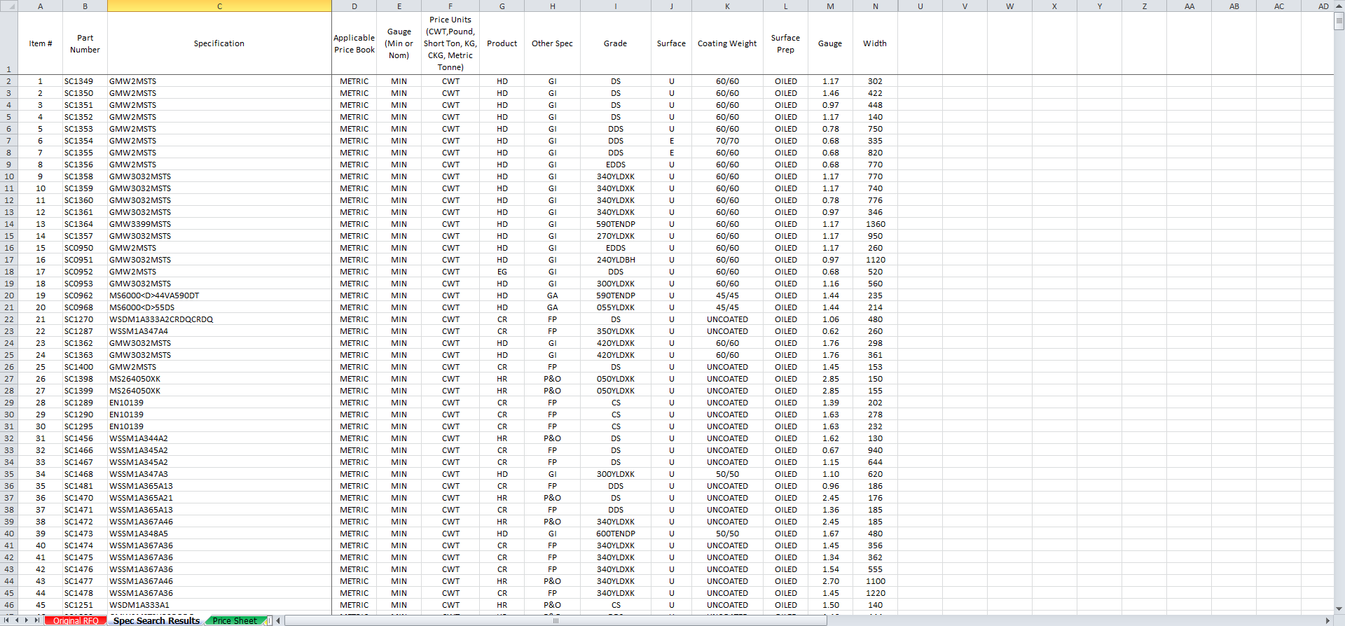 Original RFQ – This is an example of a major part supplier’s RFQ. It has 1410 lines and has a typical array of products, grades, sizes, etc. The first step in pricing this RFQ is to put it through our Spec Search Tool that begins to fill in the input data for the Pricing Tool.